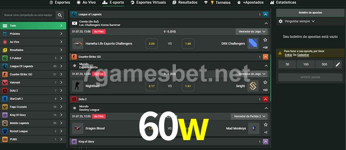 O 60w oferece uma grande seleção de opções de apostas em e-sports com probabilidades competitivas